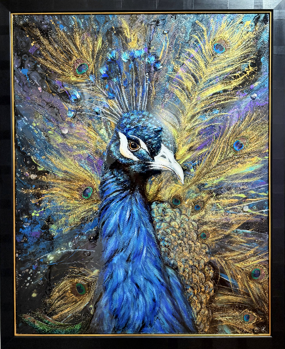 Portrait d'apparat d'un Lion avec papillons bleus sur fond de logos Hermès or, cadre rétro éclairé bleu