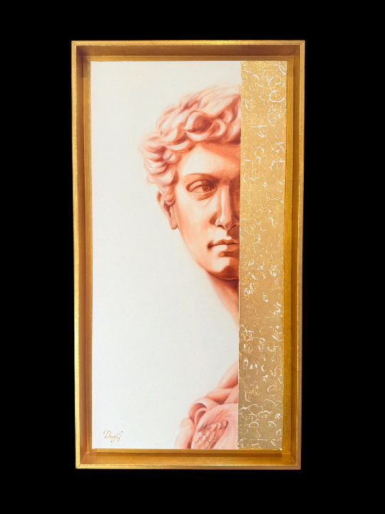 Peinture monochrome d'un athlète grec en pleine bataille, portant à bout de bras un python à la gueule ouverte doré à la feuille d'or 22 carats