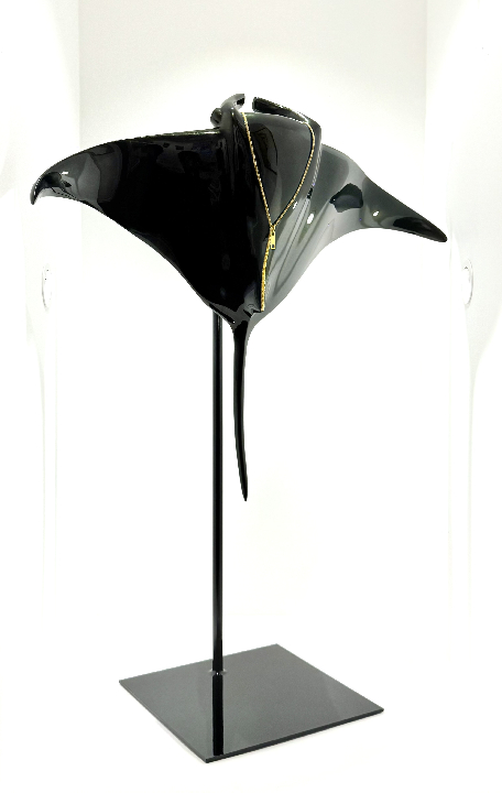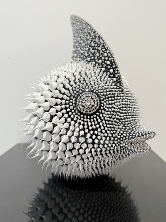 Sculpture en résine d'un poisson lune noir, pointillisme de silicone et de strass Swarovski