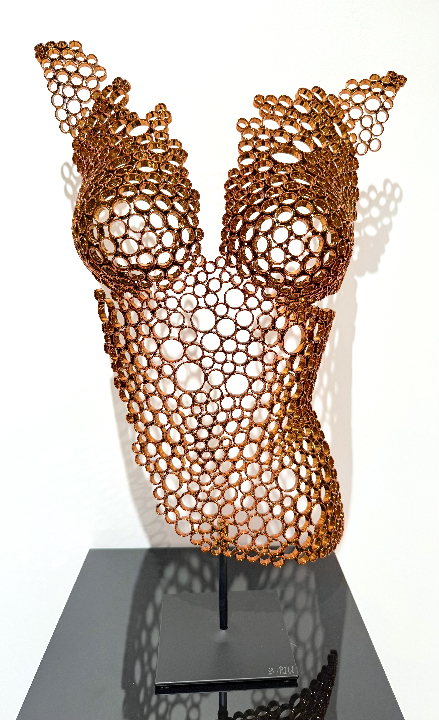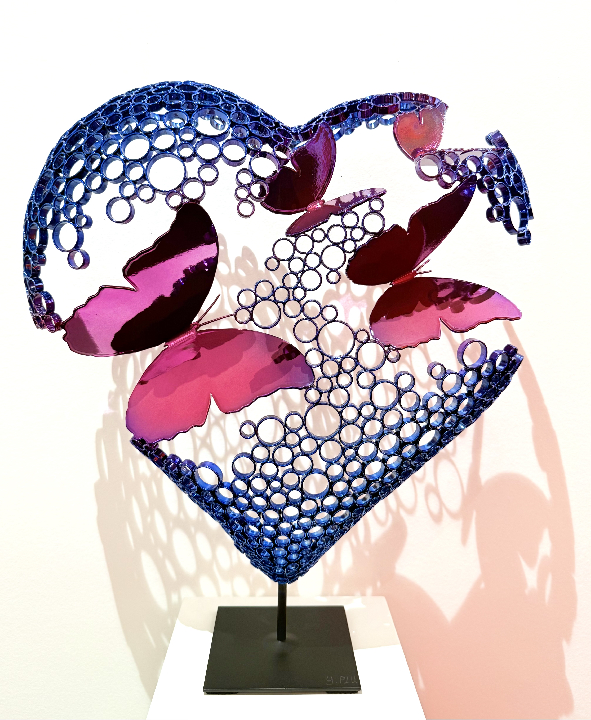 Sculpture d'un coeur avec des papillons peints dans les tons bleus Klein et réalisé à partir d'anneaux de cuivre mécano-soudés