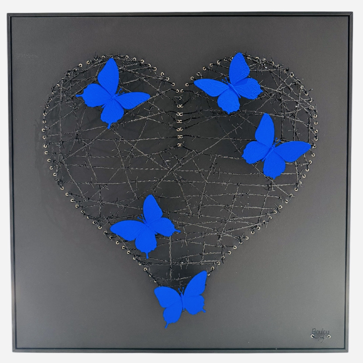 Composition de différents papiers cousus avec l'inscription "Amour" peinte par dessus