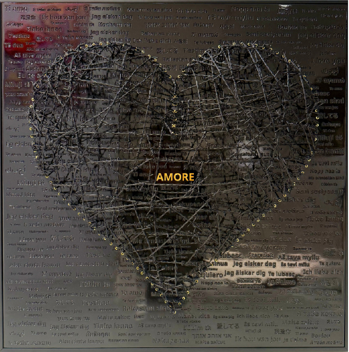 Tableau d'un coeur en fils barbelés peints en noir, rehaussé de papillons teints en bleu Klein