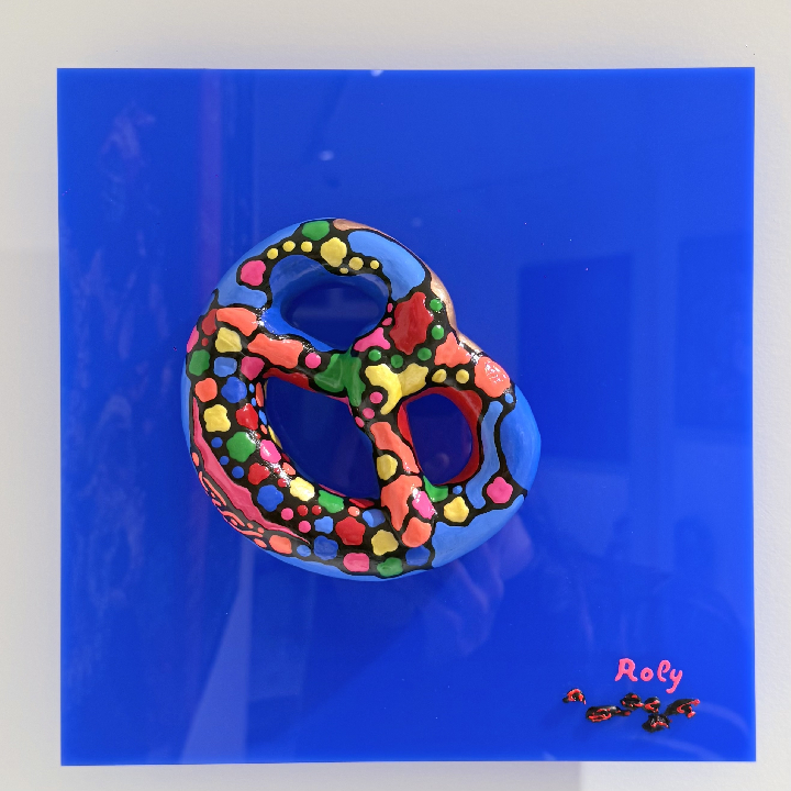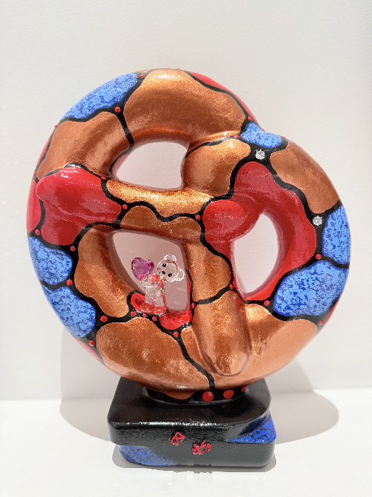 Véritable bretzel boulangère, traitée et peinte à la main, incrustation d'une figurine de Toucan en verre de Murano.