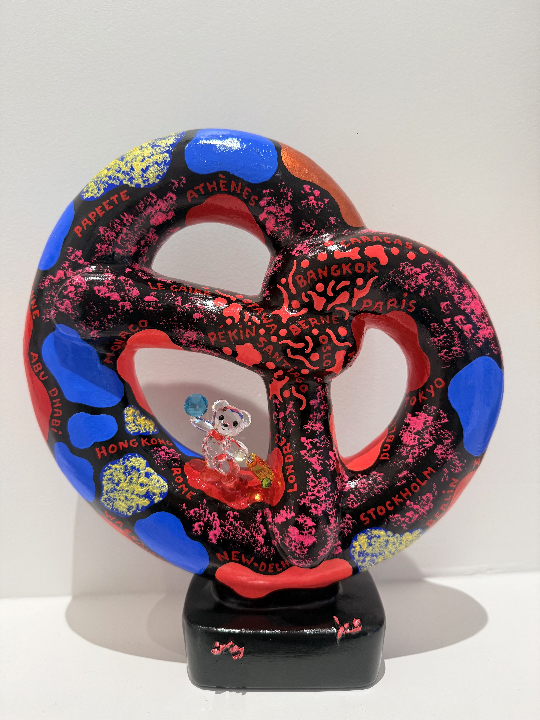 Véritable bretzel boulangère traitée et peinte à la main, incrustation d'une figurine d'oiseau noir en verre de Murano